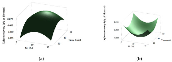 Figure 3a,b show an opposite trend of xylose recovery; furthermore, there was a curvature of pretreatment time effect on xylose recovery in solid and liquid pretreated OPEFB hydrolysate. This curvature supposedly gave an optimum value of SL and pre-time. Using SL of 15% gave the highest xylose recovery in solid pretreated OPEFB hydrolysate. Furthermore, a combination of the longest pretreatment time of 60 min and SL of 15% gave the highest xylose recovery in solid pretreated OPEFB hydrolysate. On the contrary, xylose recovery in liquid pretreated OPEFB hydrolysate was lowered with the increase in SL and pretreatment time. The highest xylose recovery in liquid pretreated OPEFB hydrolysate was obtained at SL of 5% and a pretreatment time of 15 min. This contrast in pretreatment time and SL combination between solid and liquid pretreated OPEFB hydrolysate showed that optimization should be performed for each biomass matrix. The minimum peak of xylose recovery in liquid pretreated OPEFB hydrolysate shown in Figure 3b was obtained at the pretreatment time of 37.5 min and SL of 10%.