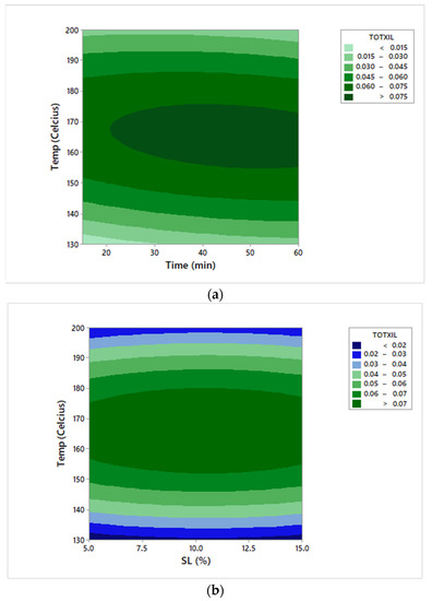 As discussed in the previous section, Figure 4a,b show that there was curvature on the surface plot. The xylose recovery in solid and liquid pretreated OPEFB hydrolysate increased as pretreatment time increased, with a slight decrease for solid pretreated OPEFB after 37.5 min. The maximum xylose recovery in solid and liquid pretreated OPEFB hydrolysate was approximately at a temperature of 165 ± 5 °C and pretreatment time of 60 min. The results ensured that optimization should be performed in order to obtain an optimum combination of pretreatment time, temperature, and SL.