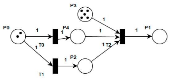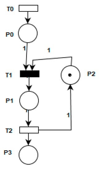 In Figure 11, places P0 and P1 need to receive an entity in order for T0 to be enabled. Synchronization is common in a dynamic system for an event to occur. This can be represented, for example, by a situation in which two pieces need to be assembled before being transported. The existence of two different parts makes no sense at the point at which they are joined to form a single entity.