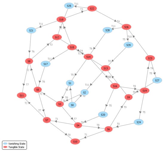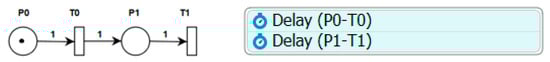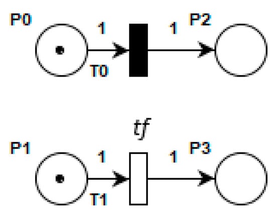 As a convention, this document will use the PIPE software representation [41,42]: black rectangles for immediate transitions and white rectangles for timed transitions. The white rectangle must have a time function (tf), which specifies the duration of the transition [3].