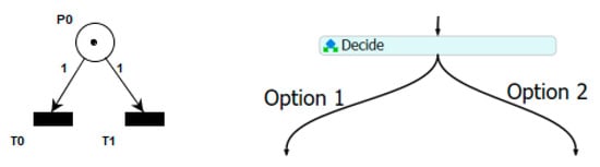Transitions T0 and T1 are in conflict in this Petri net: both are enabled, but the firing of either one disables the other, see Figure 6. This situation will arise, for example, when an AGV must choose at an intersection between two different routes. The resulting conflict may be resolved in a non-deterministic or probabilistic way. This situation, in which the entity must choose between two different transitions, can be coded in FlexSim using the Decide activity and can also be solved in either of the two ways.