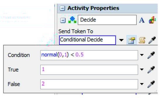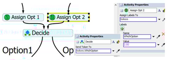 The Decide activity can have one or multiple inputs as well as one or multiple outputs, see Figure 7. Each output is assigned a positive integer number (the first option is 1, the second option is 2, etc.) All inputs enter the Decide activity and exit to the assigned output. Therefore, the deterministic or probabilistic solution of the conflict will depend on the number that is “assigned” to each token, as the number assigned for each output is not changeable. For a deterministic solution, labels (equivalent to colors in a colored Petri net) can be used. These labels can be assigned before the Decide activity or may exist from previous processes.