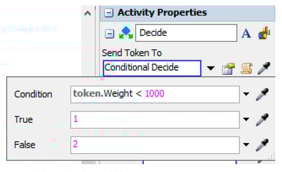 Let us imagine that, depending on the weight of the cargo, we will choose one option or another (deterministic decision). Specifically, if the cargo weighs less than 1000 u, it will exit by option 1; otherwise, it will exit by option 2. This can be configured in FlexSim by assigning the labels previously, see Figure 8.