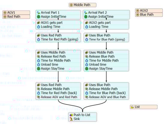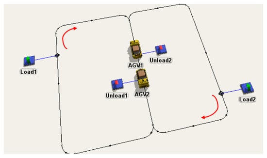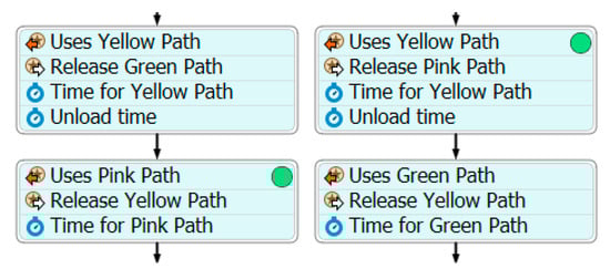 The two proposed solutions need to be simulated in FlexSim to obtain results for different state systems so that they can be compared. This is different to the previous cases, as there are two possible alternatives to prevent deadlocks: (i) original case (possible deadlock) and (ii) solution (blocking the middle path with only one AGV), see Figure 21 for the original case with possible deadlock, and Figure 22 for the proposed solution (blocking the middle path).
