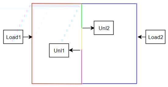 In this example, AGV1 needs to move cargo from Load1 to Unload1 and analogously for AGV2. Eventually, AGV1 and AGV2 may enter the same lane from opposite sides, blocking the whole system. This situation arises because AGV1 wants to access Unload1 and AGV2 wants to access Unload2, but they cannot collide or pass over one another, leaving us with two vehicles that want to move but whose paths are blocked.