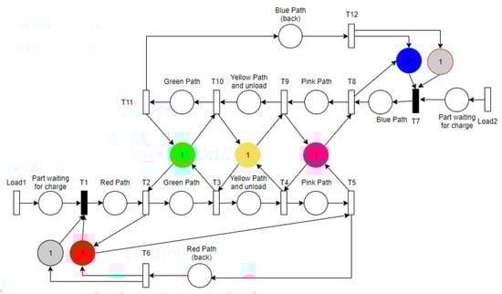 The case shown in Figure 12 can be transformed into a Petri net. While one AGV covers part of the tracks, the other AGV cannot. Ideally, every inch of the tracks should be a resource, but this is not helpful. Therefore, the representation is divided into different sections according to their use by the AGVs. The different paths are divided as shown in Figure 15, where they are represented with different colors.
