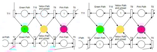 The system becomes deadlocked if both AGVs attempt to use the middle path at the same time from opposite sides. One possible solution is, for the first AGV to reach the middle path road, traps all the resources until the vehicle departs. The other AGV, if idle, must wait until the first vehicle releases the resource. The new Petri pet is displayed in Figure 19.