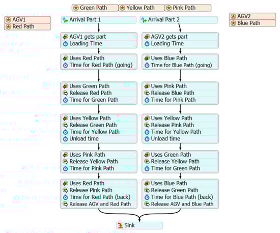 FlexSim® [43] is a commercial simulation package that allows the execution of discrete and continuous simulation models. Being a commercial suite, it allows the definition of the simulation models following a proprietary and graphical approach, based on the connection of different simulation objects that allows representing the model behavior in a process interaction paradigm [44], see Figure 4.