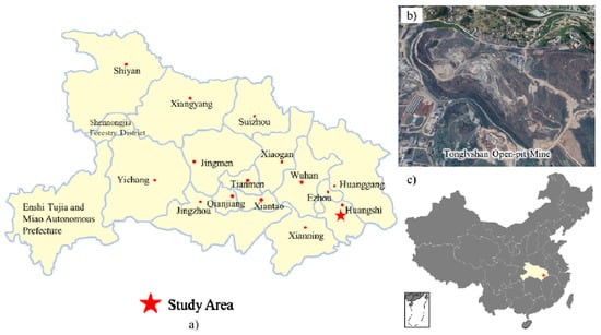 Tonglvshan open-cast mine: (a) location of mine in Hubei province; (b) a view of the mine (Resourced from Google Earth); (c) location of the mine in China.