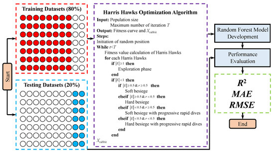 The procedure of developing an HHO-RF model is shown in Figure 3. Firstly, the collected database should be divided into training datasets and testing datasets with a ratio of 80% and 20% [60,61,62,63]. Then the Harris hawks optimization algorithm will be used to search the best combination of the number of variables used to grow each try (mtry) and the number of trees (ntree) in the RF model, and the final RF model will be established. Finally, the testing datasets can be used to evaluate the RF model by using some performance metrics such as correlation coefficient (R2), mean absolute error (MAE) and root mean square error (RMSE).