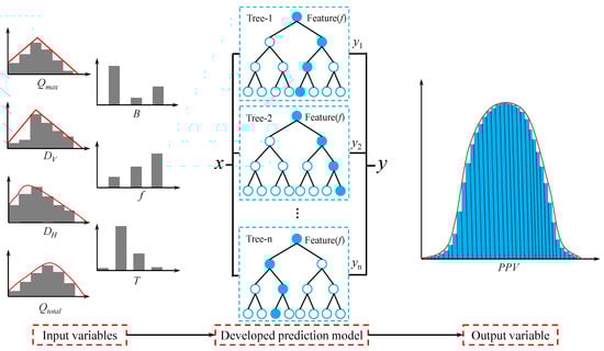 The Monte Carlo (MC) simulation method is a typical sampling technique in stochastic modeling and has the ability to realize the risk and uncertainty in many problems such as financial cost and purchase decision [69]. Monte Carlo simulation can achieve two important functions; the first is the quantitative investigation of uncertainty and variation of problems regarding risk; and the second is the investigation of parameters affecting variation and uncertainty and their percentage [70]. In the calculation process, the repeated sampling method was utilized to create a large number of combinations of input variables, then these input variables will be calculated by using the HHO-RF model developed. Finally, statistical analysis will be carried out for obtaining the probability distribution of PPV values (see Figure 4).