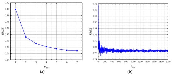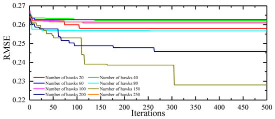 To obtain the best combination of mtry and ntree, 8 HHO-RF models with the maximum number of iterations of 500 and variable numbers of Harris hawks ranging from 20 to 250 were developed. The fitness curve of these HHO-RF models checked by RMSE can be found in Figure 7. As shown in Figure 7, there is no significant change after 350 iterations. But the escaping energy of the rabbit has a relationship with the maximum number of iterations in the HHO algorithm according to Equation (3). The change of the maximum number of iterations may affect the optimization performance of the HHO algorithm. Hence, 500 and 150 were chosen as the best parameter combination of HHO-RF modeling in view of the excellent prediction performance.