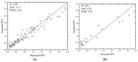 As shown in Figure 8, the established HHO-RF model can predict and evaluate the PPV with R2 of 0.94, MAE of 0.17 and RMSE of 0.23 for training datasets and R2 of 0.94, MAE of 0.29 and RMSE of 0.34 for testing datasets. After comparing the prediction performance obtained by the RF model and HHO-RF model, the comparison results show that the HHO-RF model can be used to predict the PPV with a higher level of prediction accuracy.