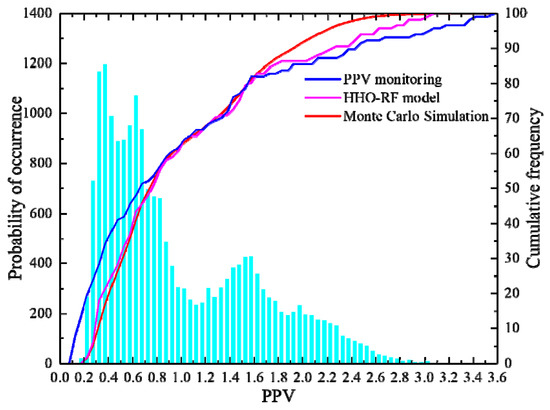 After analyzing, the probability distribution of blast-induced ground vibration is shown in Figure 10. As can be seen, the mean value of PPV in MC simulation results is determined as 0.98 cm/s while the mean value of PPV is 1.0 cm/s in the database, and the PPV value does not exceed 1.95 cm/s with a probability of 90%. Moreover, the measured PPV values, the predicted PPV values by the HHO-RF model, and the Monte Carlo simulation results are also shown in Figure 10. It can be observed that these three cumulative frequency curves are closely related and the curve performed by the MC simulation is smoother. It is also found that these cumulative frequency curves still have some differences, and the differences may be due to the small amount of the monitoring database being too small and the error of the prediction model.