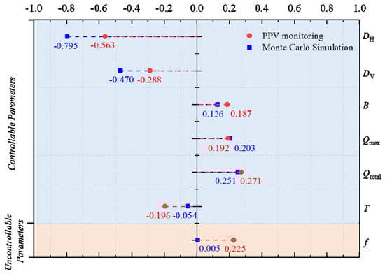 To analyze the impact of various blasting parameters on blast-induced ground vibration, a sensitivity analysis was performed to measure the impact of various parameters on peak particle velocity. In this section, with the help of SPSS (Statistical Product and Service Solutions), the relationships between two variables can be calculated with the range of −1 to +1 after sorting the database and comparing the rank of each value. Figure 11 shows the impact of these input variables on PPV values both in blast-induced ground vibration database and MC simulation results. As shown, the DH with the correlation coefficient of −0.795 and −0.563 is the most sensitive variable, and the input variables can be divided into controllable parameters and uncontrollable parameters. The controllable parameters can be listed in descending order as DH, DV, Qtotal, Qmax, T and B in the PPV monitoring database and DH, DV, Qtotal, Qmax, B, T in MC simulation results. It is found that there is a difference in the ranking of T and B in these two databases. The reason may be that the PPV monitoring database is too small and the ranking order obtained from the MC simulation results is more reliable according to the big data principle. Meanwhile, the roughly same order of input variables demonstrates that the Monte Carlo simulation is reliable.