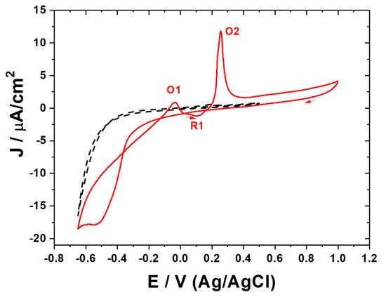 Cyclic voltammograms related to the electrodeposition and stripping of copper on the epitaxial graphene (in absence and in presence 0.1 mM Cu2+, as dashed black and solid red curves, respectively; 0.1 M HClO4, scan rate 20 mV∙s−1).