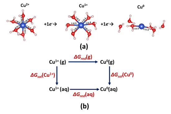 We performed DFT calculations in order to assay the reduction thermodynamics. The Cu2+ ion was considered, when coordinated with six water molecules [98], energetically, the most favorable complex (Figure 2a). All calculations were performed using the aquo complexes of copper species, because the intrinsic or extrinsic solvent models did not give satisfactory results.