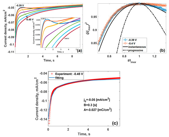 where A, B and jL are fitting parameters. It was revealed that that the best fit can be achieved by using the following parameters as follows: A = −0.027 mC/cm2, B = 0.3 s and jL = −0.05 mA/cm2 (Figure 3c).