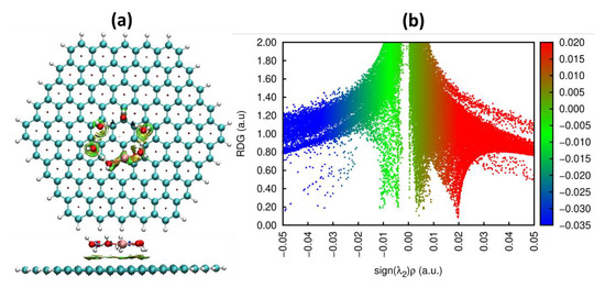 Noncovalent interaction (NCI) analysis enabled us to visualize the weak interaction between [Cu(H2O)6]0 and graphene, which manifests itself as the green and light brown-colored nonbonding interaction areas located between copper and graphene in the vicinity of the top site (Figure 4a) and in the presence of two spikes within the sign(λ2)ρ region ranging from −0.01 to 0.01 a.u. (Figure 4b).