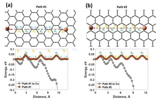 Potential energy curves for the movement of metallic copper atoms along the path #1 (a) and path #2 (b) in the presence and in the absence (marked by cross) of another copper atom. The height of the Cu atom was set to 2.723 Å. Note: the potential energy curve was normalized to the total energy of the system with a copper atom located at the top site of the graphene (energetically the most favorable site for copper adsorption); ti, bi and hi designate the possible sites (top, bridge and hollow, respectively) that are available for copper atom adsorption.