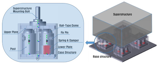 The practical system is a complex structure in which multiple isolation devices support the superstructure, as shown in Figure 1. The one device is a symmetrical structure in which multiple spring dampers, to each of which a ball-type dome is attached, are vertically fixed to the lower plate to support an upper plate made of a concave surface. To consider the theoretical vibration characteristics of this system, structural simplification is needed. If we consider only two degrees of freedom in the vertical and horizontal directions without rotational motion, the behavior of multiple isolators is the same motion, so the system can be simplified to the distributed mass at one isolator and isolator, as shown in Figure 2a. The rotational motion is ignored because several mounts on the horizontal plane are used symmetrically on the vertical plane and the vertical displacement is small in the seismic excitation. The base structure also receives ground excitation, while the superstructure contains the equipment to be protected.
