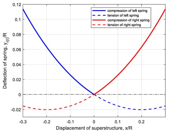 In the design, is possible in the range of 0.5 or less. On the other hand, this value must be properly selected to ensure the maximum permissible moving displacement of the superstructure. So, the deflection of the spring with the displacement x varies in the isolation system with a = 0.2, owing to the fact that the range of −0.3 ≤ x ≤ 0.3 was numerically interpreted and is shown in Figure 3. Figure 4 illustrates that if the spring is not preloaded, the dome and superstructure may not make contact. Therefore, the spring must be properly preloaded, because the dome and superstructure must always be in contact for the vertical spring-viscous damper to function effectively.