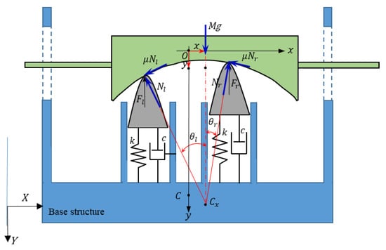 When relative motion occurs between the base structure and superstructure, energy loss takes place, owing to the changes in the vertical potential energy, friction force, and viscous damping force. In Figure 2, point is the origin of the x–y coordinate system set in static equilibrium, in which the system sets the x-axis as the horizontal line through the contact points of the dome and superstructure, and the y-axis as the vertical line passing through the center of the base structure.