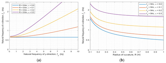 In order to numerically investigate the natural frequency variation in the x direction due to the influence of the design parameters, it was analyzed for R = 0.6 m and = 5 Hz and is shown in Figure 5. As illustrated in Figure 5a, the change in is insignificant in the area where is small, but when is large, increases rapidly, and it changes more steeply as α increases. It can be observed that, when α is large, the change in with respect to is large, resulting in the same effect as the small curvature radius . That is, a larger installation distance ratio () results in greater stiffness in the x direction.