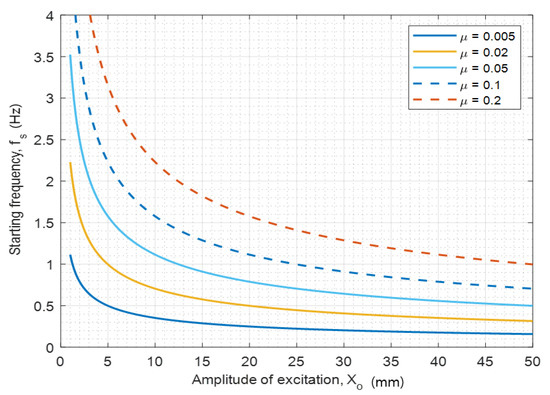 In Equation (15), denotes the frequency at which relative motion begins to occur, so we refer to it as the starting frequency. Moreover, as is a function of the excitation amplitude and friction coefficient (friction force), the desired value can be adjusted by determining the friction coefficient in accordance with the excitation amplitude condition. Figure 6 illustrates the changes in according to the amplitude and any friction coefficients. These data are very useful for initial design.