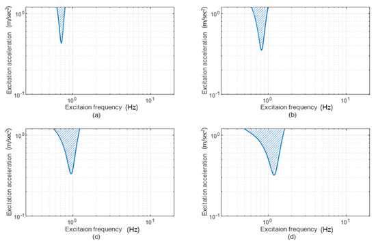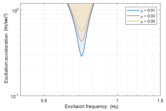 In Figure 12, where the coefficients of friction were 0.008 to 0.05, it can be observed that as the friction coefficient increased, the excitation frequency at which the relative motion began also increased. This means that as the frictional force increases, the excitation force must also increase to induce relative motion. The starting frequencies obtained from Equation (14) are displayed in Figure 12a.