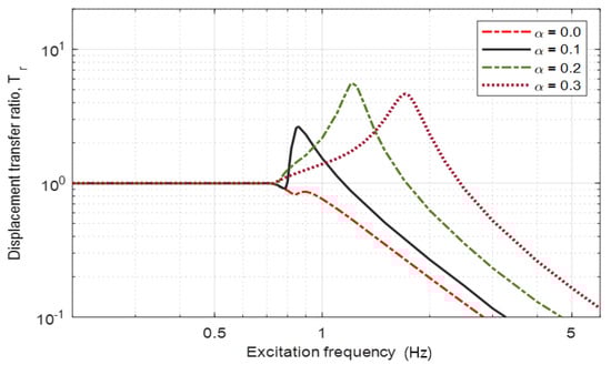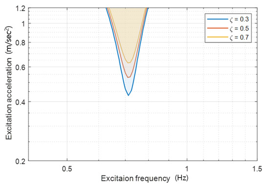 Figure 13, Figure 14 and Figure 15 illustrate the values for the design parameters of , α, and ζ, respectively. As the excitation amplitude and friction coefficient μ were 5 mm and 0.01, respectively, the values were all equal to 0.71 Hz from Equation (15) or Figure 6, regardless of . Thus, did not change until the excitation frequency reaches 0.71 Hz, as indicated in Figure 13, Figure 14 and Figure 15.