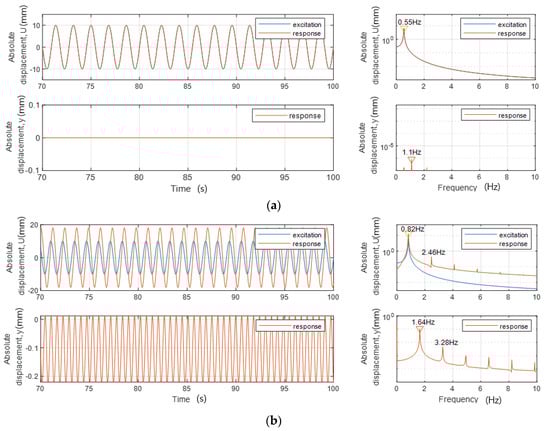 The vibration isolator in this study had the structural characteristic of the superstructure moving in the horizontal and vertical directions; therefore, it could exhibit vibration isolation performance in both directions. Thus, we considered the response characteristics for the vertical excitation. As can be observed in Figure 2, the device structure was symmetrical, so no horizontal movement occurred when only vertical excitation was applied. Therefore, from Equation (9), the motion equation for vertical excitation can be expressed as follows: