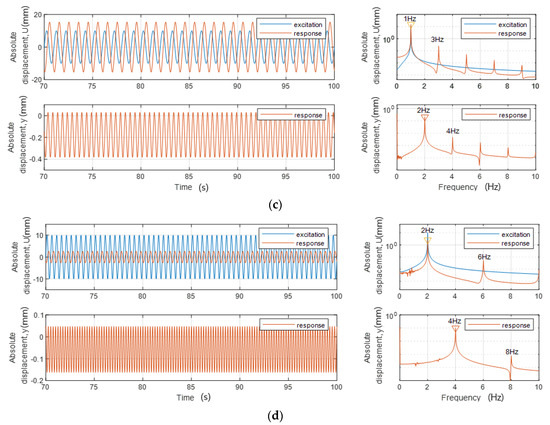 Steady-state response of harmonic excitation under Hz, , , m, and : (a) Excitation conditions: mm and Hz. (b) Excitation conditions: mm and Hz. (c) Excitation conditions: mm and Hz. (d) Excitation conditions: mm and Hz.