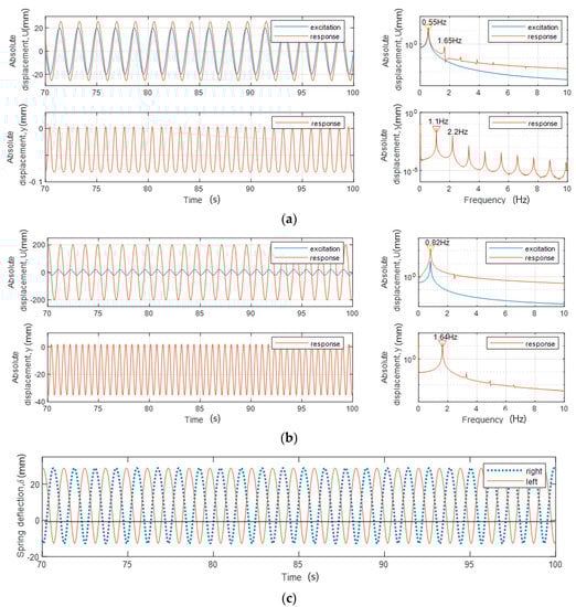 Steady-state response and spring deflection under Hz, , , m, and : (a) Excitation conditions: mm and Hz. (b) Excitation conditions: mm and Hz. (c) Spring deflection: mm and Hz.