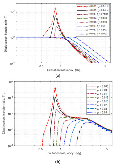 Displacement transfer ratio of peak–peak value of the steady-state response to that of the excitation displacement for friction coefficient , when Hz, m, , , and mm: (a) Horizontal direction (peak–peak value of versus that of ). (b) Vertical direction (peak–peak value of versus that of ).
