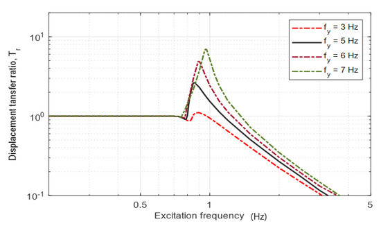 Figure 13 illustrates when was 3, 5, 6, and 7 Hz and was 0.72, 0.82, 0.89, and 0.96 Hz from Equation (13) or Figure 5, respectively. In the case of = 3 Hz, because was 0.71 Hz, which is almost equal to the natural frequency 0.72 Hz, the resonance was suppressed and the maximum was 1.1, which is slightly larger than 1. However, as indicated in Figure 13, in the other cases, the maximum also increased because the difference between and increased.
