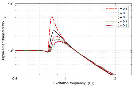 Figure 12 illustrates the values of the horizontal and vertical motions for various friction coefficients. The results obtained were for a seismic isolator with Hz, = 0.6 m, and , where was 0.82 Hz for this device, according to Equation (13). In the case of the friction coefficient of in Figure 12a, relative motion did not occur, as until the excitation frequency reached 0.51 Hz, following which relative motion occurred. Moreover, resonance appeared at 0.82 Hz, and it is represented as a frequency response function of the one-degree-of-freedom system, where at times the resonance frequency. For frequency ranges greater than 1.16 Hz, was less than 1, and it decreased as the excitation frequency increased. In Figure 12b, which presents the vertical transfer ratio with the same friction coefficient, does not appear because no horizontal relative motion occurred until 0.51 Hz. However, as horizontal relative motion occurred in the frequency range greater than 0.51 Hz, is displayed in this case. The vertical value also reached its maximum at of 0.82 Hz with the maximum horizontal .