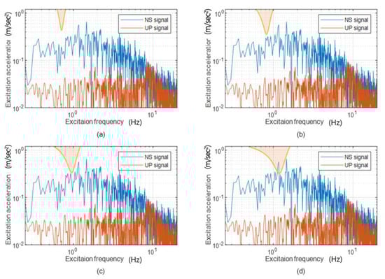 Overlaps of contact stability charts of Figure 9 and power spectral density of two El Centro earthquake waveforms (NS signal and UP signal): (a) Hz. (b) Hz. (c) Hz. (d) Hz.