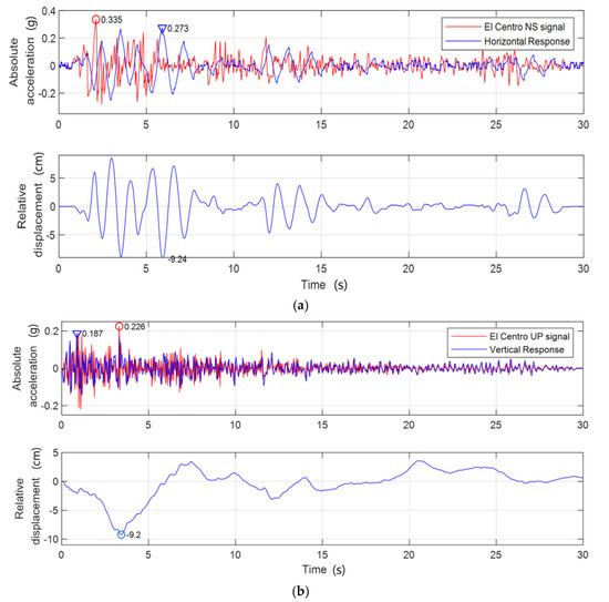 Figure 17 illustrates the horizontal and vertical responses of a device with the design parameters in Figure 7a, when the NS (North–South components) signal and UP (vertical components) signal of the El Centro earthquake (http://www.vibrationdata.com/elcentro.htm) were excited horizontally and vertically, respectively [40]. Moreover, Table 2 compares the maximum response values for the device of Figure 7b. The maximum acceleration response of the isolator (I) was reduced by 45% (▼0.15 g) and 40% (▼0.091 g) in the horizontal and vertical directions, respectively, compared to the maximum acceleration input. In isolator (II), it was decreased by 40% (▼0.131 g) and 17% (▼0.039 g), respectively. These results can be further improved by changing the damping ratio or friction coefficient. Therefore, it can be concluded that the proposed device is effective for excitation in both the horizontal and vertical directions.