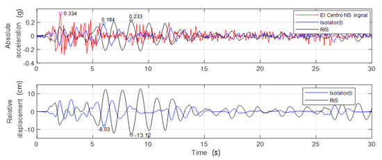 Also, it was compared with a rolling bearing isolation system (RIS) without a vertical spring damper. Figure 18 compares the horizontal response of the RIS and the isolator (I) due to horizontal excitation of an El Centro horizontal earthquake signal. The design parameters of RIS were 0.6 m, a natural frequency of 0.66 Hz, and rolling resistance coefficient 0.004, and the design parameters of the isolator (I) were = 3 Hz, α = 0.1, μ = 0.02, 0.6 m, and ζ = 0.3. The maximum acceleration of RIS decreased 0.101 g (30%) to 0.233 g, while the isolator (I) decreased 0.15 g (45%) to 0.184 g. Even when only horizontal excitation works, the isolator (I) with vertical damper performs better than the RIS.