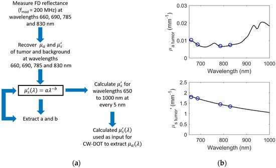 The proposed hybrid FD/CW method is a three-step process starting with capturing quantitative FD measurements at multiple tissue views over the tumor-containing heterogeneous tissue. In this paper, the FD measurements were acquired at a limited number of wavelengths (660, 690, 785, and 830 nm), which were used to recover optical reduced scattering μ s and calculate a reliable prefactor (a) and power (b) by fitting the data to the empirical Mie scattering relationship μ s ( λ ) = a ( λ 500   n m ) b [28,29].
