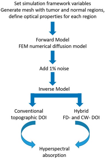As our goal was to compare the hybrid DOI method to the conventional topographic DOI, we performed two different inversions. For the conventional topographic DOI method, a semi-infinite analytical diffusion model [33] that assumes optical homogeneity in the medium was utilized to extract 2D topographic maps of tissue optical properties (absorption μ a and reduced scattering μ s ) for each wavelength ranging from 650 to 1000 nm at every 5 nm. The optical properties corresponding to normal and tumor containing tissue were extracted at each wavelength by averaging the properties over regions of interest (ROIs) selected on the 2D maps. The tumor and normal ROI were manually chosen over the 2D spatial maps of reconstructed properties. These homogeneous model based results also served as the initial guess for the hybrid DOI hyperspectral recovery. Figure 2 depicts the simulation overview.