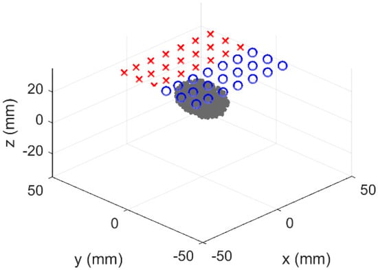 To generate simulated data, a 3D rectangular slab mesh consisting of 139,435 nodes corresponding to 710,944 tetrahedron elements was used. A second 3D slab mesh with a total of 45,688 nodes corresponding to 215,430 tetrahedron elements was generated to perform reconstructions to avoid inverse crime [34]. Our tissue model mimicked a human breast tissue containing an ellipsoidal tumor. The 20 mm × 30 mm × 20 mm ellipsoidal tumor was investigated at depths varying from 0 to 10 mm between the surface of the tissue (i.e., skin) and top surface of the tumor. This represents a typical range of palpable breast tumor depths studied with reflectance-based DOI [35]. The source and detector geometry represents the manual translation of a simple single source–detector separation (SDS) probe with a separation of 28 mm over a 1 cm spaced rectangular 2D grid pattern [5], similar to that used in the ACRIN 6691 multicenter trial of diffuse optical spectroscopy in breast cancer therapy [36]. We initially simulated an array of multiple SDSs, but because of use of hard spatial a priori information for normal and tumor regions within the heterogeneous tissue, the additional SDSs did not increase the overall accuracy. The overall geometry is illustrated in Figure 3. The source detector arrangement lies in such a way that the long axis of the ellipse was taken along the line between the source and detector. This was an arbitrary choice that is not expected to influence the simulations.