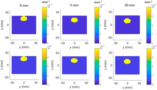 Figure 6. Ground truth (row 1) versus simulated recovery (row 2) in μ a (650 nm) at different tumor depths (columns).