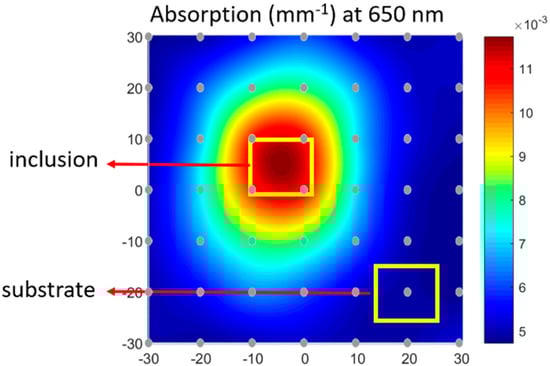 The optical properties were recovered for every grid point measured using the homogenous model. Following this, the properties were spatially interpolated to generate 2D color maps from which ROIs were manually selected for the inclusion and substrate to quantify the properties for each wavelength. An example of the absorption map at 650 nm and the ROI selection is shown in Figure 7 below. The grid points have been overlaid on the figure.