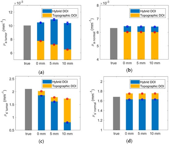 Figure 8. Bar plot representation of ground truth (gray), hybrid DOI, and conventional topographic DOI simulated recovery in μ a at 650 nm for (a) tumor and (b) normal tissue and μ s at 650 nm for (c) tumor and (d) normal tissue.