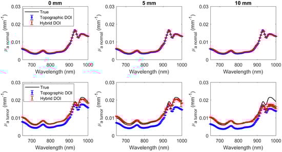 Reconstructions were acquired for 71 wavelengths ranging from 650 to 1000 nm every 5 nm (Figure 9 and Figure 10). The error bars indicate the deviation over five repetitions. The mean difference and the mean percentage difference of the recovered ( μ a , μ s ) from the true ( μ a , μ s ) over all wavelengths have been summarized in Table 3 for both topographic DOI and hybrid DOI techniques at all tumor depths considered.