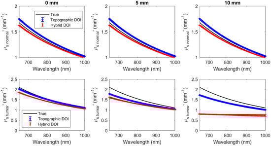 The recovered broadband optical properties μ a and μ s using the hybrid DOI technique for wavelength range of 650 to 1000 nm are shown in Figure 9 and Figure 10, respectively. Each panel of Figure 9 and Figure 10 compares the hyperspectral results from hybrid DOI technique to the topographic DOI results and the true ( μ a , μ s ) values. Different columns correspond to different depths of the tumor from the tissue surface (0, 5, and 10 mm), whereas different rows correspond to the normal and tumor containing tissue optical properties.