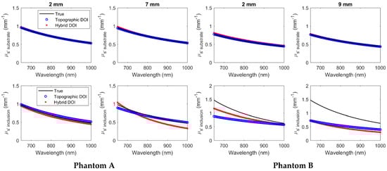 Figure 11 and Figure 12 show the broadband μ a and μ s spectra of the inclusion and substrate optical properties reconstructed from the two heterogeneous tissue-simulating phantoms. Each panel of Figure 11 and Figure 12 compares the broadband results from hybrid DOI technique to the topographic DOI results and the true ( μ a , μ s ) values of the phantom. Broadband optical properties for substrate and inclusion were reconstructed for 71 wavelengths from 650 to 1000 nm on each side of phantoms A and B. Measurements on different sides of the phantoms corresponds to different depths of the inclusion from the phantom surface. The top and bottom row correspond to the substrate and inclusion absorption of the phantoms, respectively. The true spectra for the substrate was measured on the inclusion phantoms (A and B), by acquiring a measurement away from the inclusion. This was done to ensure that the optical path does not interrogate the inclusion. The true spectra for the inclusions of phantoms A and B were acquired by measuring a separate homogenous phantoms that were made from the same batch material/composition of the inclusions in A and B.