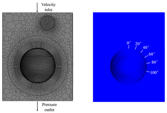 The mesh plot of 3D verification model and measuring positions are shown in Figure 1. The simulation scales are the same as those in Du’s experiments [19]. The validation experiment was conducted under atmospheric pressure and at a temperature of 273 K. A particle of 10 mm in diameter was positioned in a cylinder region whose diameter and length are 20 mm and 25 mm respectively. A water droplet of 4 mm in diameter was patched 5 mm above the particle and slightly offset from the central axis (about 2.82 mm). For the region within 17 mm of the particle and droplet surface, meshes with the highest resolution were used (0.07 mm for 3D cases). For the other region, the largest-scale nonstructural meshes were adopted. The top entrance was defined as the velocity inlet for the gas phase and the exit was defined as pressure outlet conditions. The time step used in the simulation was 1 × 10−5 s, and the initial velocity for the liquid droplet was set to 0 so that the droplet fell down only by gravity. The simulated results were recorded every 5 ms, and the liquid film thickness was measured at different positions of the particle surface at different time intervals.